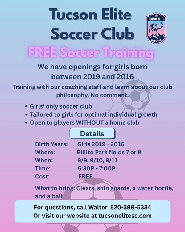 Come and join us this week, 9/9 - 9/11, in FREE soccer training sessions. We would love you to meet Tucson Elite SC. There is no obligation beyond just showing up. and letting the girls kick the ball around